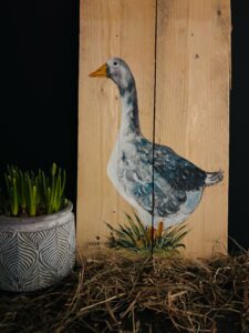Op een houten paneel schilderen jullie een gans. Deze leukerd kan binnen in je huis hangen maar dit houten paneel kan ook buiten in je tuin of onder je veranda hangen. Om tot een mooi resultaat te komen gebruiken we altijd verf van het merk Amsterdam! Kosten Euro 47,50
